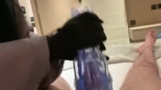 MISTRESS MILKS THE COCK OF HER SLAVE WITH LATEX GLOVES